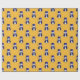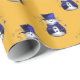 A whimsical wrapping paper, featuring a cute snowman dressed in a blue velvet top hat and waistcoat, surrounded by blue stars on a gold background for Christmas.