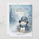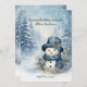 Surprise birthday party! A softly illustrated winter scene features a charming snowman dressed in cozy shades of blue, standing among snow-covered evergreen trees as gentle snowflakes and sparkling lights drift through the air. Delicate winter foliage surrounds him, and the cool, peaceful palette of icy blues and whites creates a calm, nostalgic atmosphere. Personalize with your own information.