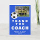 Blue Soccer Thank you Coach Team Photo Card. The card has a black and white soccer ball and a custom photo. Great card for thanking sports coaches, high school team trainer, mum or dad coach, etc. Customise any text on the card. Add the coach`s name, team name and year.