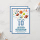 Featuring colorful sports balls, party hats, confetti, and a bold customizable age, this design is perfect for a 10th birthday sports party or any energetic kids celebration.