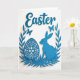 This design shows a long-eared bunny nestled beside an ornate egg, both shown in a rich cerulean blue that feels calm and affectionate 🐰. Curving leafy fronds rise from the bottom and wrap upward like a gentle embrace, giving the scene a cozy, close-together look. Near the top center, the word “Easter” appears in flowing blue lettering, spaced above the main illustration so it feels airy rather than crowded 🌷. The artwork has a cut-out, layered look against a bright white background, with soft shadows that make each shape seem slightly lifted. Two small winged insects hover in the upper left and upper right, adding a light, flirty sense of motion around the couple-like pairing below. The egg is filled with delicate floral and geometric details, while the bunny’s smooth silhouette leans toward it as if sharing a quiet moment. All elements stay within the same blue tone, from the leaves to the insects, creating a unified scene. The white space around the wreath-like framing and the pale shadows under each piece keep the composition crisp and airy.