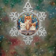 This lovely trio of cats - the middle one sort of an orange tabby - want to wish you a Meowy Christmas. The blue and green art glass background has an art deco feel. The front features three cats, framed by coloured faux stained glass. The phrase underneath says "Meowy Christmas," but you can edit it oif you want.