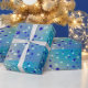 Christmas wrapping paper covered in blue stars, white snowflakes and the scriptural announcement of the birth of Christ in golden lettering. All on a multi toned blue background.