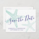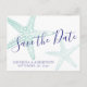 Elegant turquoise blue and navy starfish save the date postcard for a beach wedding you can design online including choice of text colour and fonts. A simple, elegant design with a traditional coastal nautical design. Perfect for tropical, beach, island, destination wedding or beach birthday party.