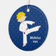 Easily personalise this kids martial arts Christmas ornament. A cute blonde haired boy illustration, wearing a white uniform and purple belt on a blue background with stars. Perfect for any little karate or taekwondo student. BEFORE you place your order -- Contact us for FREE COLOR CHANGES (belt colour, hair colour, background colour, etc.)