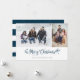 Custom blue Merry Christmas photo cards featuring two photos with a calligraphy title on the front and blue and white stripes at the back. Easily personalise these blue calligraphy Christmas photo cards with your images, a family name and the year.