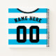 This design is an soccer (football) / rugby / sports style jersey with a v-neck collar and blue horizontal hoops / stripes, the background colour can be changed, just click on 'CUSTOMIZE'.