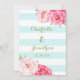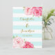 Wedding invitation custom template cards in light pastel aqua teal turquoise sky blue and white stripes pattern with pink fuchsia hot pink rustic vintage flowers and gold handwritten style vintage text. Customise these invitations with your wedding details. Available in matching products for all of your wedding needs.