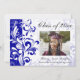Add your one digital picture photo online! Pretty graduation or party invitation features blue and white background with fancy stunning white curling swirls and scrolls. A pretty, girly yet classy and formal invitation style. High contrast royal blue and white adds the perfect touch for the female graduate of any major, class or year.