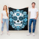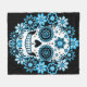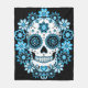 Dia de los Muertos sugar skull in colourful hues of blue surrounded by flowers.