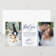 Photo card personalised with two of your own wedding photos. Thank you written in an elegant swirly deep blue script above a personal message to your wedding guests. Add your names too!