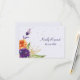 This RSVP card features a modern floral bouquet in predominant colours of blue, violet, gold and tangerine orange. The watercolor floral image is placed at the lower left edge, with your custom text in blue at the centre. The images and text are placed on a light grey blue background, with bits of confetti gold. The back of the invitation is light grey to make it easy for your respondent to mark, and with your text in matching blue. Elegant, modern, and appropriate for weddings in any season! Be sure to see the matching wedding products in our store.