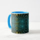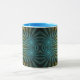 Coffee mug with "Blue Tango" an abstract design copyright © 2009, Susan Wallace. Textured fans in shades of blue and green swirl and spiral together, meeting in pinpoints of neon bright light. Full wrap-around design.