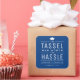 Modern "the tassel was worth the hassle" typography design in blue and white, great personalised sticker for graduation party favour or gift.