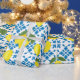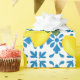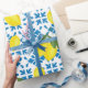 This wrapping paper features a watercolor French country tile and lemon pattern in blue and yellow.