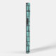 This phone case has a geometric design of tiles with rhombus shapes in light blue on a field of gray.