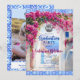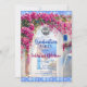 Watercolor-painted Greek island Mamma Mia-themed party design with magenta pink bougainvillea flowers and blue Mediterranean tiles.