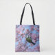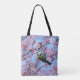 An Eurasian blue tit bird, Cyanistes caeruleus, clinging and hanging down from a branch of a pink flowering cherry blossom tree in spring. A beautiful bird photo taken by Katho Menden, this bag is a gift idea for nature lovers.