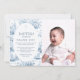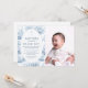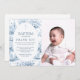 Thank loved ones with this elegant blue toile Baptism thank you card, featuring vintage blue florals, a modern design with a vintage twist. Fully editable template with space to personalise with your own photo — perfect for a baby boy's Baptism, Christening, or naming day.