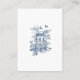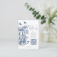 Elegant Blue Toile De Jouy QR Code Wedding Details. A blue toile de jouy floral design is to the left on the front and smaller on the back.