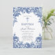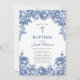 Elegant baby boy baptism invitation featuring blue toile florals, a blue cross, and a white dove. Perfect for a christening or baptism celebration. Fully customisable with your event details.