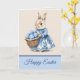 This charming Easter card features a "mother" rabbit in a toile, or Chinoiserie, style blue and white dress holding a basket of blue and white decorated eggs. The card says "Happy Easter" on the front, and "Wishing you a basketful of warm wishes for the Easter season." The inside also has a basket of eggs on the left. You can edit the text or make other changes if you wish.