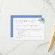 Make your wedding day uniquely yours with our customizable minimalist invite insert RSVP reply card template. This invite insert has a dusty blue flower with a place for guests to write meal food choice selection (chicken, fish, vegetarian), names, dietary needs, and song requests. Personalize your invitation enclosure with easy editable text and print with Zazzle!