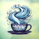 A coffee cup with the word "coding" is the centerpiece, while the rising steam is ingeniously composed of binary numbers.