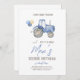 This birthday invitation features a cute blue tractor with colourful balloons trailing behind, and the name prominently displayed in big, cheerful letters. It's all about fun and excitement for the upcoming countryside tractor-themed birthday bash!