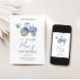 This birthday invitation features a cute blue tractor with colourful balloons trailing behind, and the name prominently displayed in big, cheerful letters. It's all about fun and excitement for the upcoming countryside tractor-themed birthday bash!