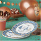 Christmas party paper plates with modern simple blue and ''golden'' Christmas trees and dotted pattern in same colours. Easily personalise the text or leave some of it blank - Kate Eden Art
