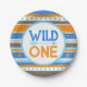 Wild One 1st Birthday Party Paper Plates. Includes a bright fun tribal inspired print in Royal Blue, Baby Blue, Orange, Brown and Tan.