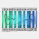 Musical decor kitchen towels with a treble clef on blue, turquoise and aqua through the centre, musical notes playing across the background. Great for housewarming gift for the kitchen, dorm room, patio/pool, barbecue and as musicians gifts. CricketDiane Designer / Artist 2016 and Cricket House Studios Art and Design.