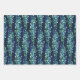 Pretty wrapping paper sheets for the holidays in a deep blue color palette featuring two patterns of blue and green twigs full of white berries, and one matching turquoise and white striped pattern.