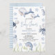Under the sea themed boy's baby shower invitation featuring a whale, calf, sea turtle, narwhal, octopus, jelly fish and more.