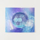 A comet flashes through the blue and purple universe adorned with a sacred geometry design.