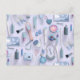 A blue arrangement of items that can be found on a vanity table; like brush, creams, camera, perfume, jewellery, brushes and so on.