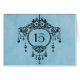 Elegant Vintage Chandelier Wedding Table Number Card featuring a stylish hanging chandelier on a light blue antique look background. The chic elegance of this design makes it perfect for a sophisticated wedding. Easy to customise, add the appropriate table number(s) in the text field provided. Click "Customise It" to find more personalisation options.