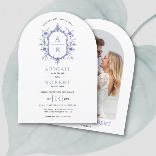 Blue elegant vintage floral crest monogram wedding invitation. This beautifully crafted invitation features a delicately designed, vintage-inspired floral crest rendered in a blue hue. Nestled artfully within the crest are the couple's initials, creating a personalised and sophisticated monogram. Below the crest, the couple's names are elegantly showcased in sophisticated, blue typography, perfectly complementing the invitation's overall romantic aesthetic. The reverse side of the invitation offers a solid, calming blue background, providing a clean and cohesive finish to this memorable keepsake.