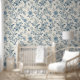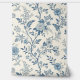 A detailed vintage floral illustration in blue tones, featuring delicately drawn branches, leaves, and blossoms on a light background, creating a classic and elegant botanical look. Toile-de-Jouy
