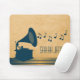 Quirky and unique Vintage Gramophone Mousepad in dark blue featuring a silhouette of an old-fashioned gramophone and a cascade of musical notes on a digital art rendered paper background. This chic mousepad will add a vintage flair to your workspace and is perfect for any music lover. Easy to customise, simply personalise with the text of your choosing. Click on the "Customise It" button to find additional personalisation options.