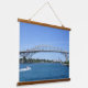 The Blue Water Bridge spans the St. Clair River, connecting Port Huron, Michigan (on the left) with Point Edward in the Province of Ontario, Canada. A motor boat is about to zoom under the bridge and pass by proud flags of America and Canada, on the port side. Beyond the bridge, the river curves to the right and flows into Lake Huron.
