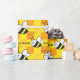 Cute little bee flying. Custom wrapping paper with yellow and orange plaid pattern in the background. Edit text to customise. Kid's party decor and gift wrap idea.