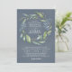 Design features a printed watercolor steel blue or deep dusty blue background with a eucalyptus wreath decorated with foliage (fern, etc.) and botanical elements in gold, shades of green and blues. The back features the same matching watercolor blue background. Elegant white typography is used within and below the wreath.