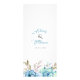 Add a touch of elegance and charm to your wedding table with this beautiful menu card that features a floral motif of watercolor flowers and leaves in hues of blue and green. The card has a delicate light blue border that frames the menu items. On the back of the card, you can see the names of the bride and groom in a stylish script font.