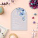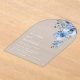 This elegant contemporary wedding invitation features watercolor painted blue flowers and a white serif font on a transparent blue background.