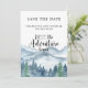 Send your save the date with this blue green watercolor mountains and pine trees forest woodland wedding with script typography. Let the adventure begin!