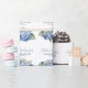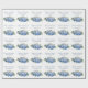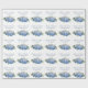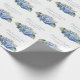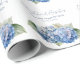 This wrapping paper features a floral watercolor design with blue hydrangeas. A delicate bouquet of hydrangea flowers is pictured below the names of a couple, followed by a sample wedding date and location. You can personalise the wrapping paper to include your own names or other custom text.