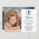Blue monochromatic watercolor leaves wreath in blue the top of this photo design with accompanying blue elaborate cross and the word "Baptism". Text is in simple black. Simply add your child's photo, name and Baptismal details. Back features a blue textured look gradient background. Composite design by Holiday Hearts Designs (rights reserved). Template placeholder photo courtesy Pexels.
