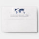 This chic, trendy wedding invitation envelope features a white watercolor paper look background with a trendy blue watercolor look world map and matching text. Perfect for the wedding of any couple who loves to travel, or anyone having a destination wedding. The inside of the envelope features matching blue watercolor.